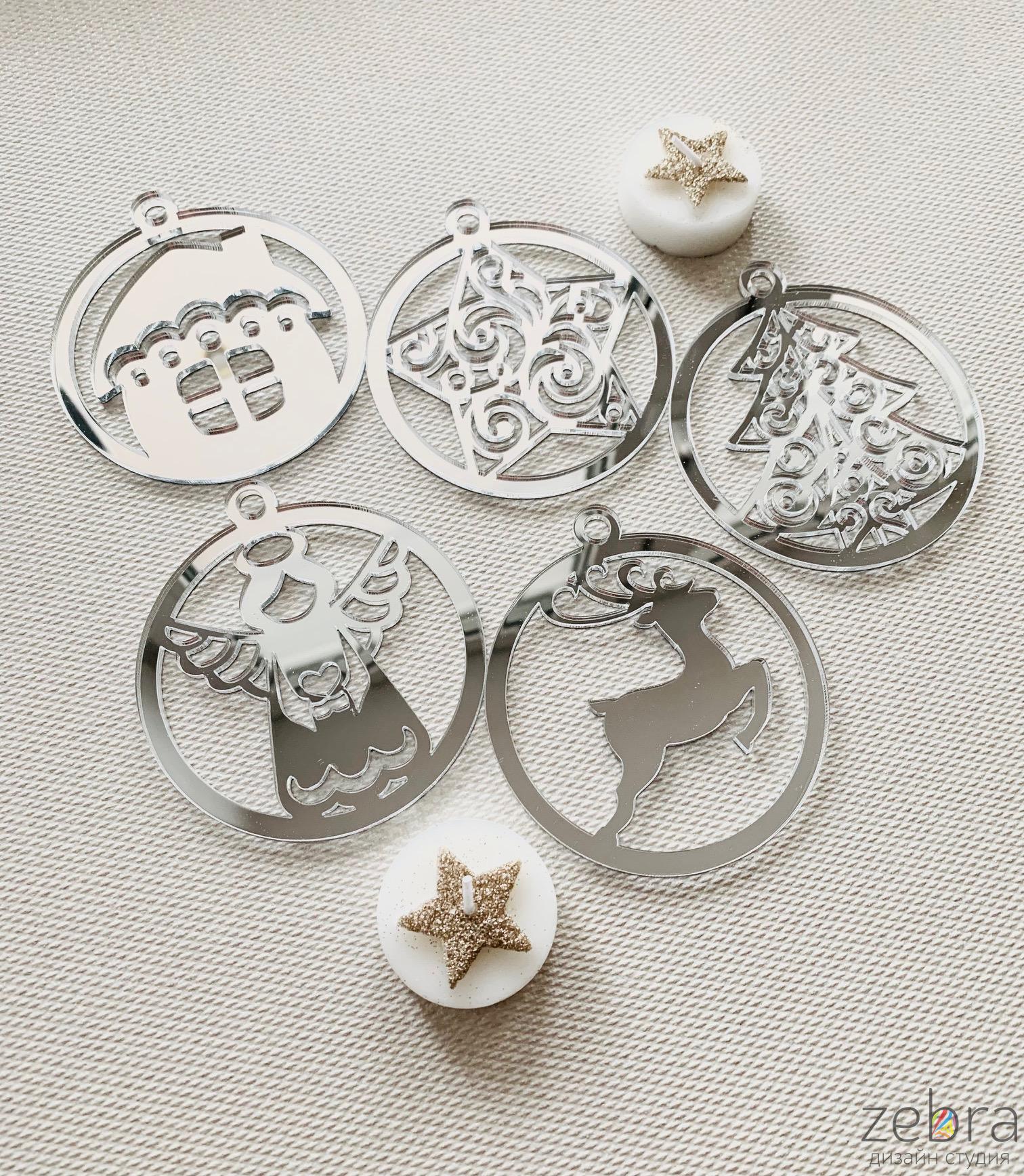 Набор новогодних ёлочных игрушек. В набор входит 5 игрушек: ангел, новогодний олень, ёлочка, звезда, домик. Диаметр элементов 9 см. Толщина материала 3 мм. Изделия в прозрачной защитной плёнке.