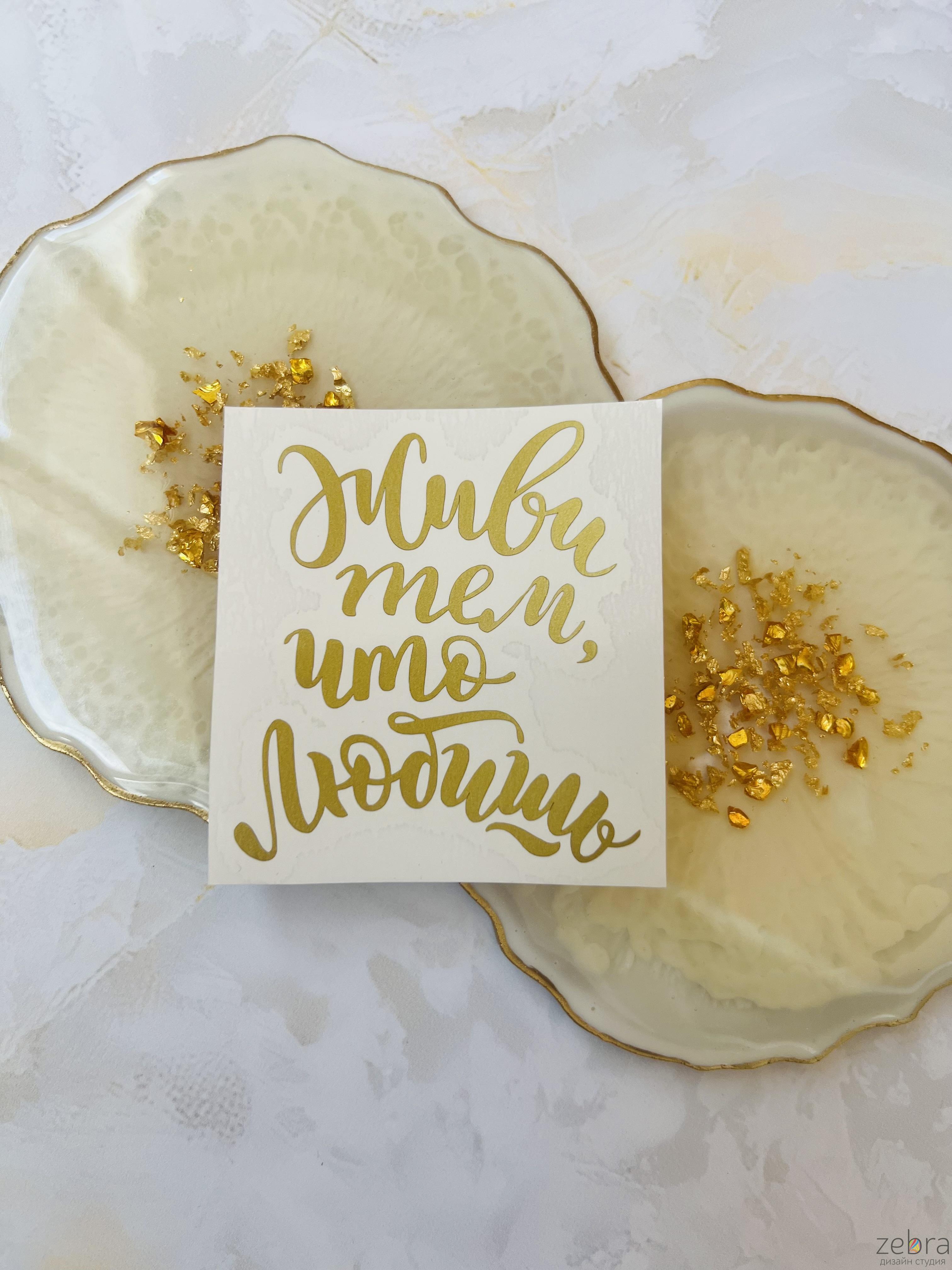 - Прозрачную плёнку с наклейкой приложить липкой стороной к поверхности изделия, после чего тщательно разгладить наклейку через плёнку по поверхности изделия, чтобы она хорошо приклеилась.