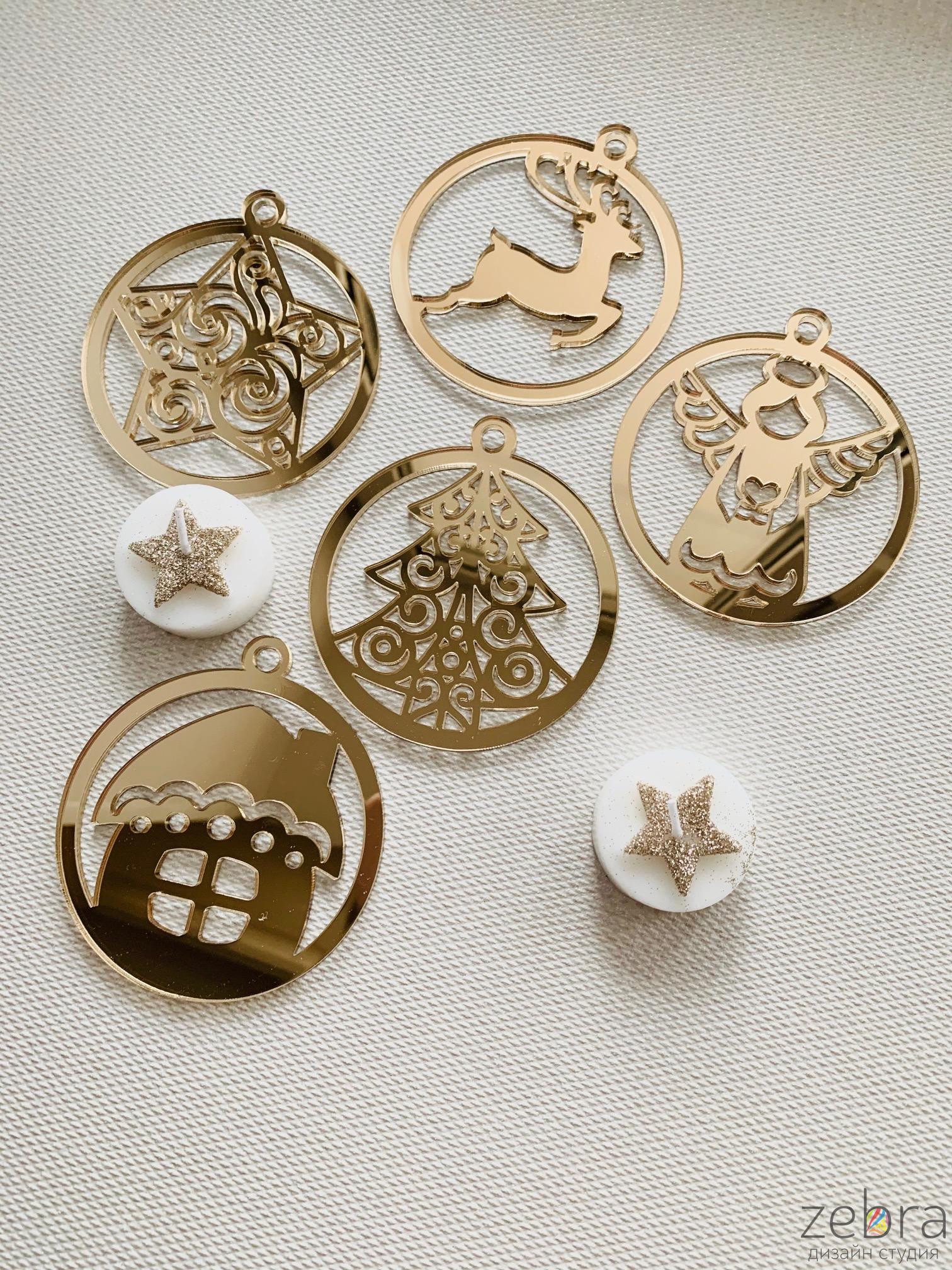 Набор новогодних ёлочных игрушек. В набор входит 5 игрушек: ангел, новогодний олень, ёлочка, звезда, домик. Диаметр элементов 9 см. Толщина материала 3 мм. Изделия в прозрачной защитной плёнке.